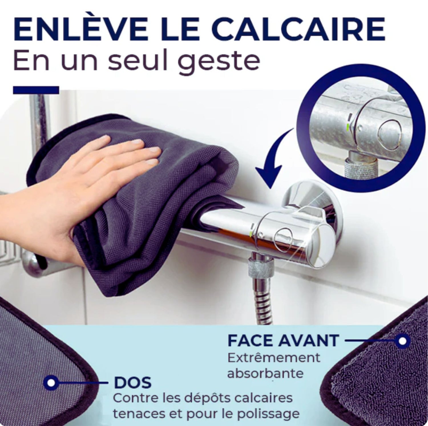 Contrairement aux autres chiffons, notre chiffon laisse un film protecteur absorbant. Celui-ci sèche les surfaces en un seul passage et les protège également des nouveaux dépôts de calcaire.